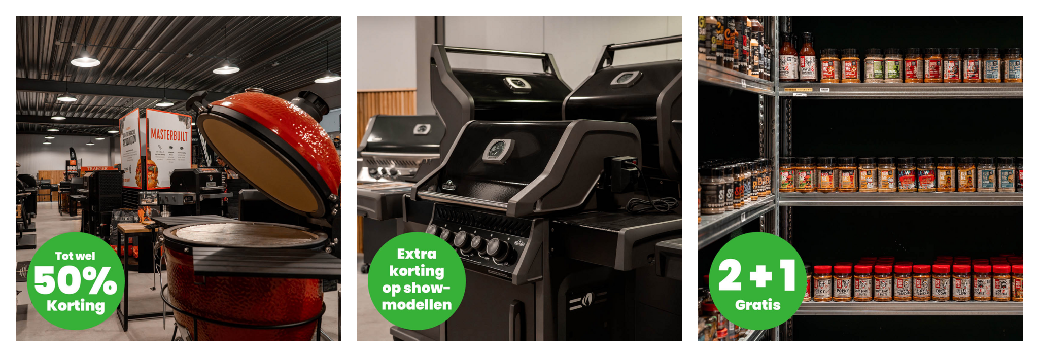 Naast hoge kortingen in onze webshop, profiteer je tijdens Black friday ook van extra acties in showroom. Zoals speciale meeneem deals op BBQ's, extra korting op showmodellen en 2+1 gratis op alle kruiden, sauzen, houtskool, rookhout en pellets. Deze acties zijn geldig t/m maandag 1 december.